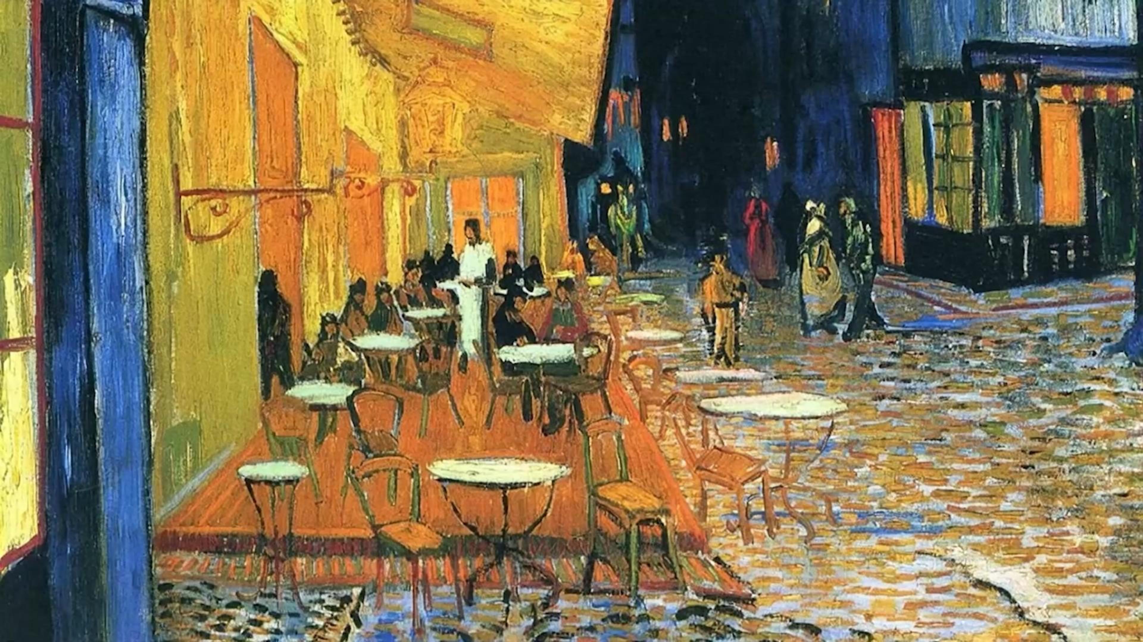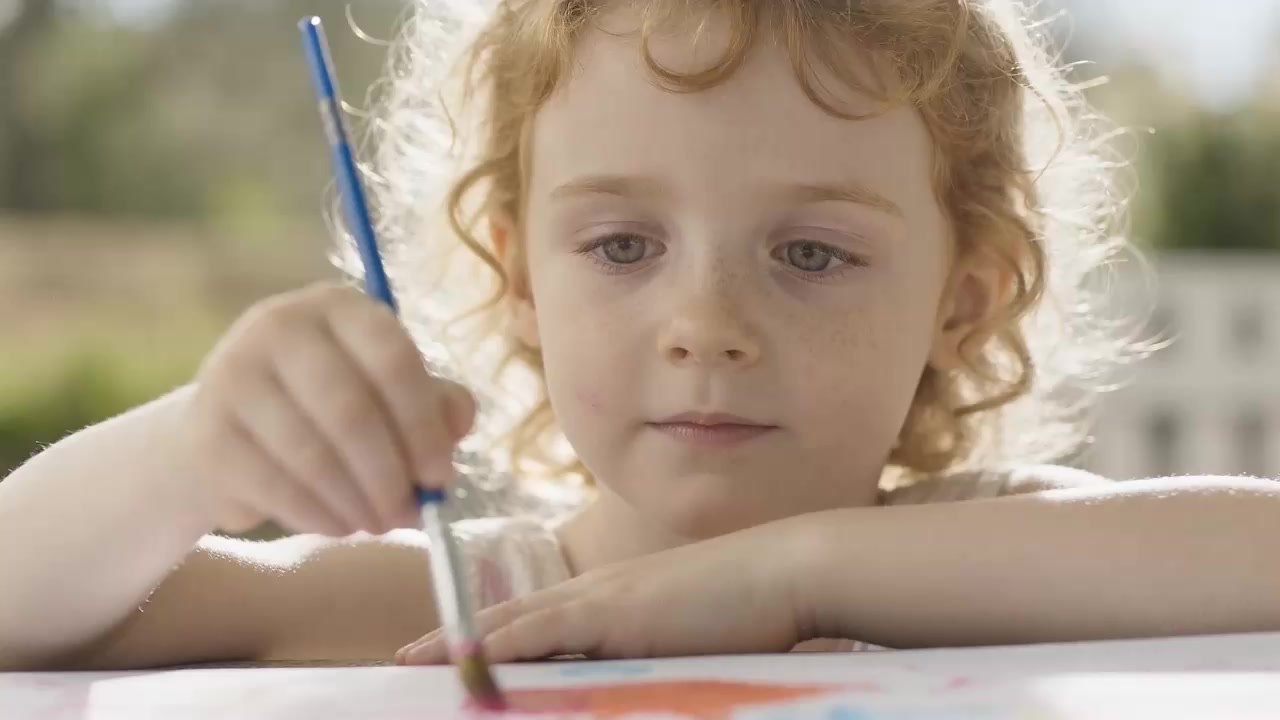 @Audio 1, opening transition has subtle shimmering light particle effects, no dialogue. Lighting/tone: Overall warm white + creamy yellow, gallery lighting is soft with no hard shadows, canvas colors moderately saturated, warm yellow soft glow for the scene, bright and airy for the present moment.