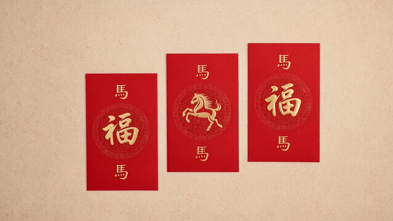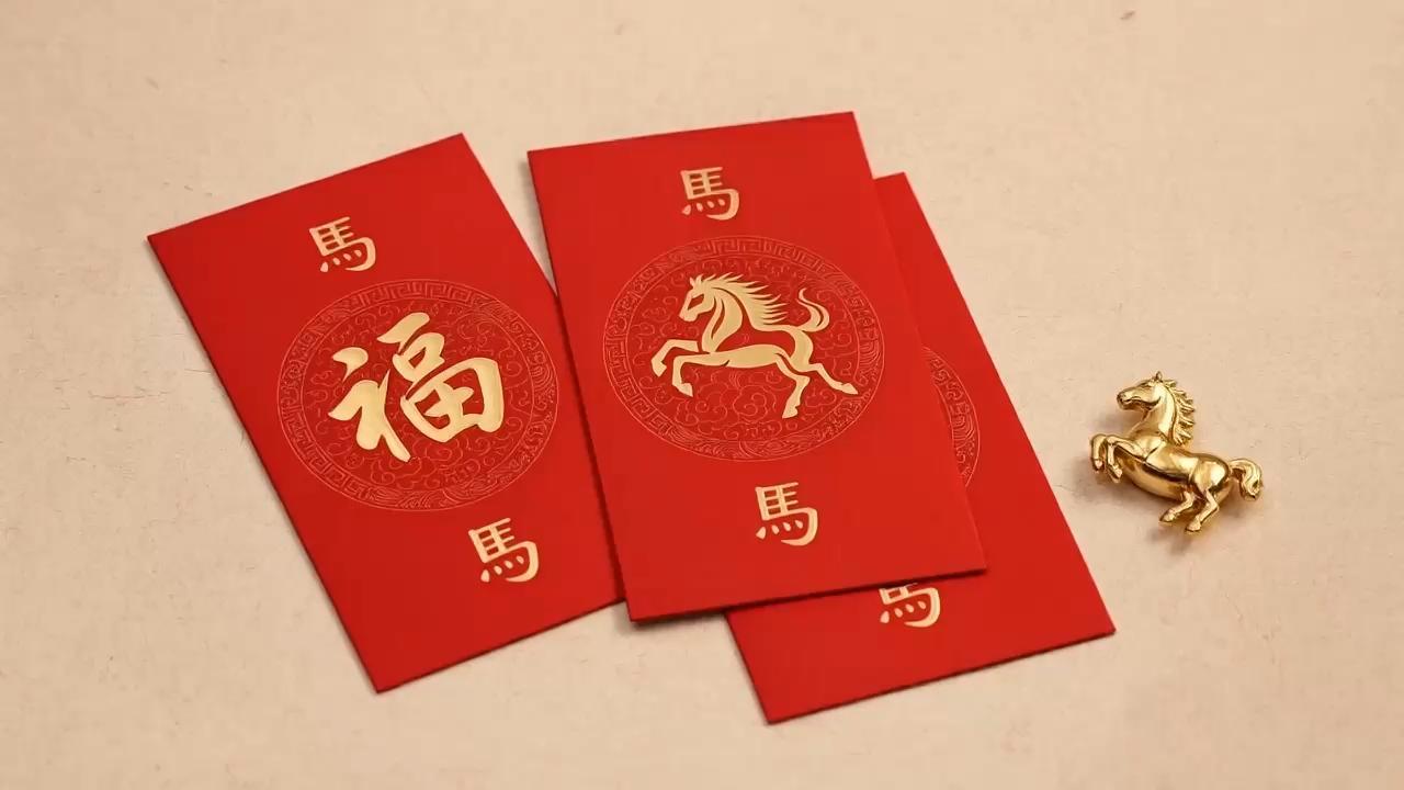 @Video 1 forward, 8-second ultra-HD Year of the Horse red envelope product showcase video. Clean and premium composition, cinematic camera movement, warm gold-red Chinese style color palette, soft diffused lighting, no cluttered backgrounds. 0-2s: Overhead slow push, 3 gold-embossed Year of the Horse red envelopes neatly arranged on a light cream textured paper background, the gold horse motif on the envelopes is finely detailed with natural sheen, gilded patterns reflecting light naturally. 2-5s: Hand gently lifts a red envelope, paper texture is crisp and firm, edges perfectly flat, camera follows with subtle motion, light and shadow shift with movement, accompanied by a delicate metallic chime sound effect. 5-7s: Close-up of the gold embossing details, the horse's lines are fluid, surrounded by auspicious cloud patterns in Chinese style, camera gently racks focus. Finally connects to