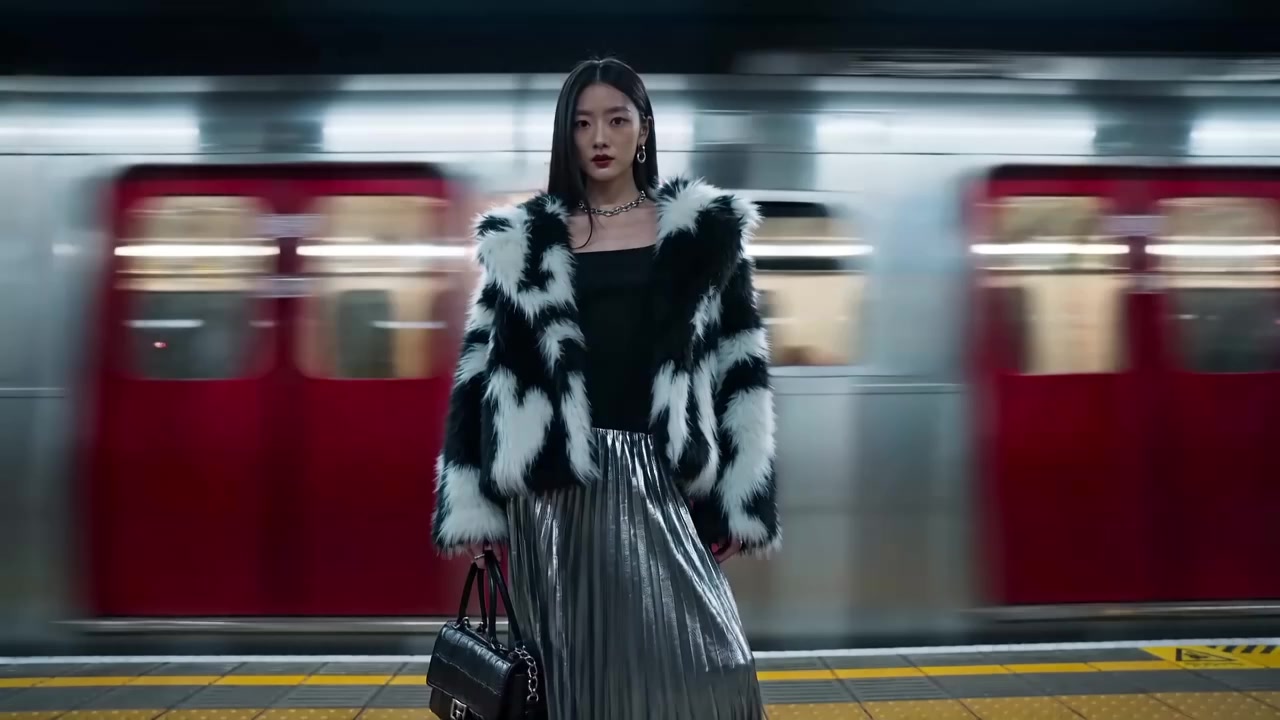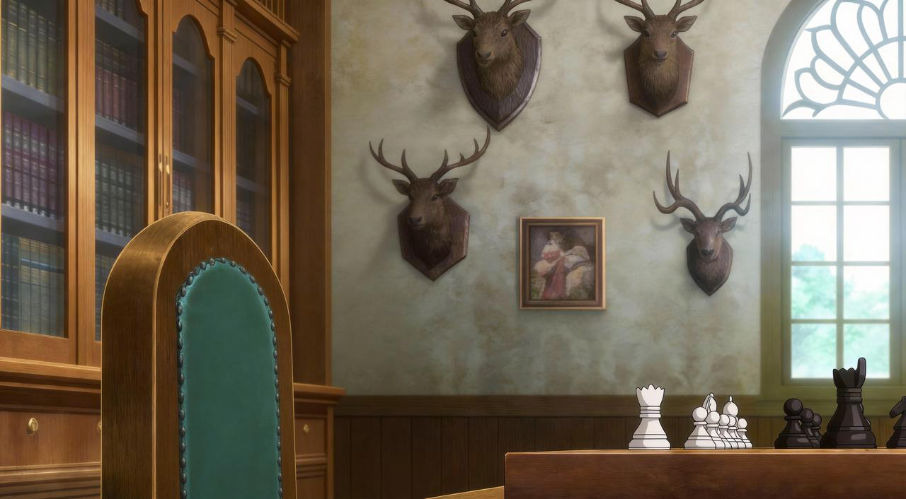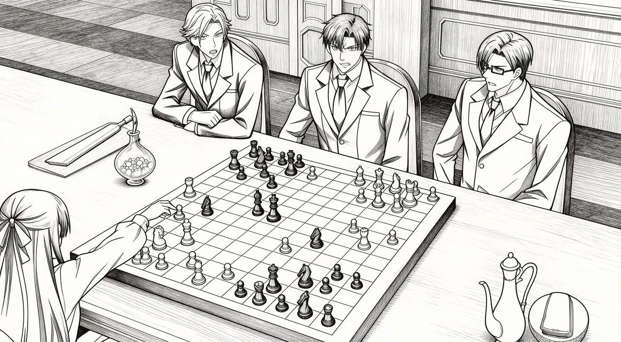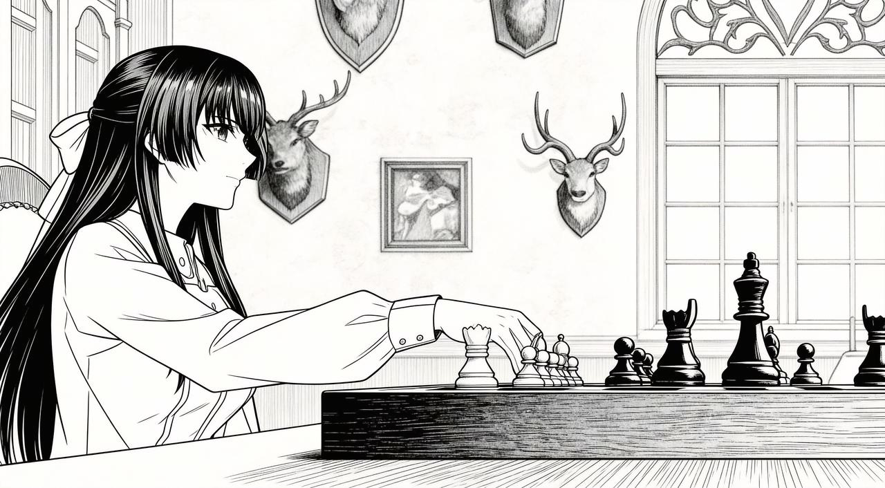 @Image 1 turns and sits down, camera cuts, she places a chess piece and says 'You lose,' referencing the storyboard in