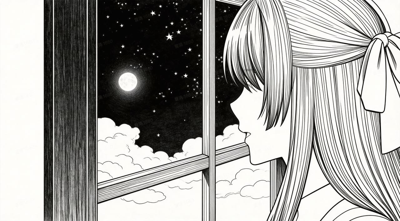 @Image 6. 6-8s: Camera rapidly tilts down, screen fades to black then gradually brightens — in a dimly lit room, the woman gazes out the window at the moonlight and quietly says 'We'll see about that,' referencing the storyboard in