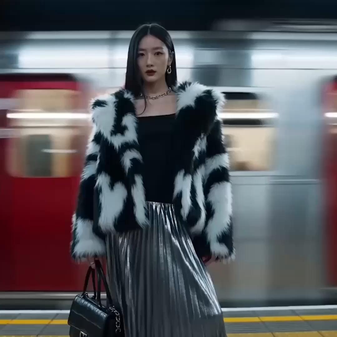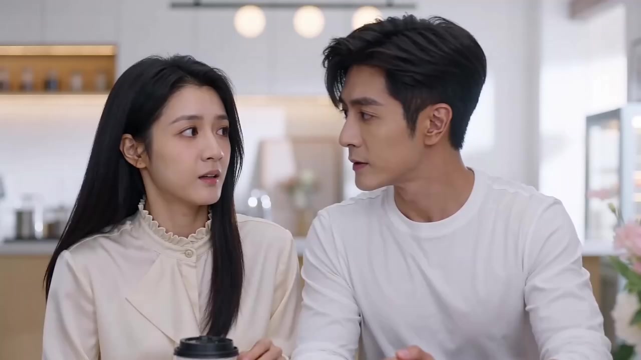 @Image 2 (both exchange startled glances) + the CEO pulls off his suit jacket and drapes it over the heroine (hand close-up), background guitar kicks in with gentle sound effects of a coffee cup dropping and fabric rustling. 2-6s: Quick-cut 3 shots — heroine wearing the CEO's jacket looks down with a shy smile (blushing cheek close-up) + CEO watches her walk away with a slight grin, saying 'Let's walk together' referencing
