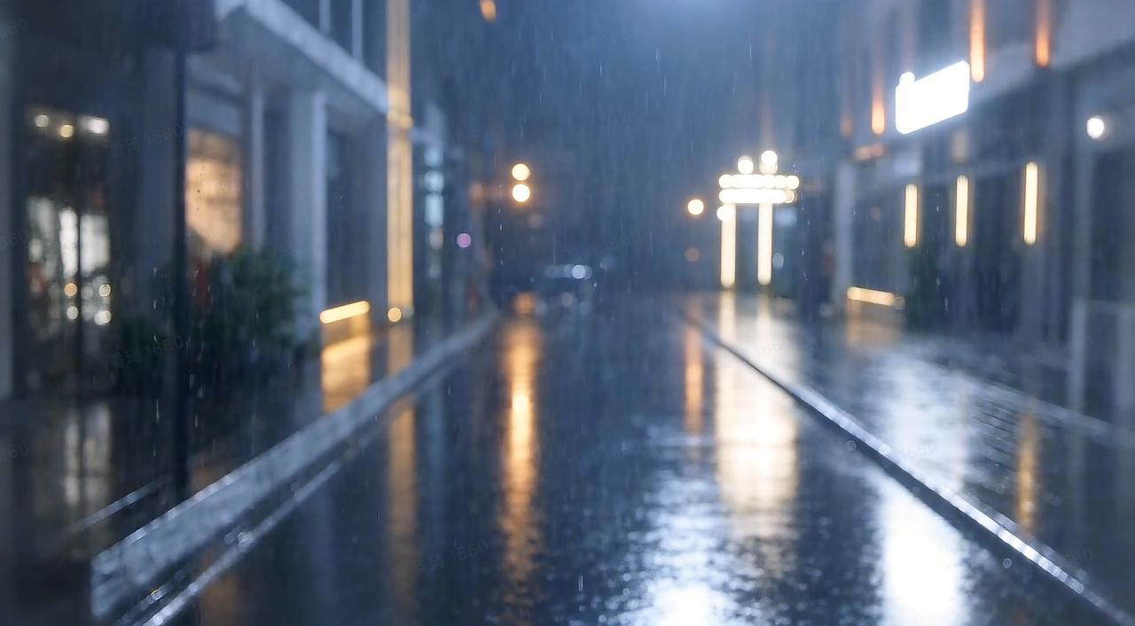 @Audio 1 (profile shot) + the two share a black umbrella on a rainy night, fingertips touch and quickly pull back (close shot), rainy backdrop from