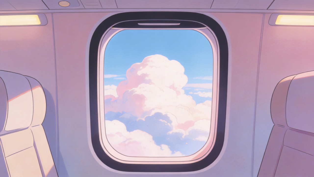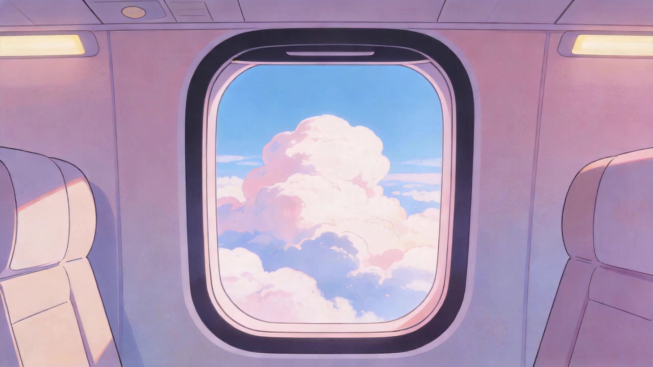 @Image 1 as the first frame, the view zooms out to the airplane window. Clouds drift gently into frame, one of them dotted with colorful candy sprinkles, staying centered in the shot. It then slowly morphs into the ice cream from