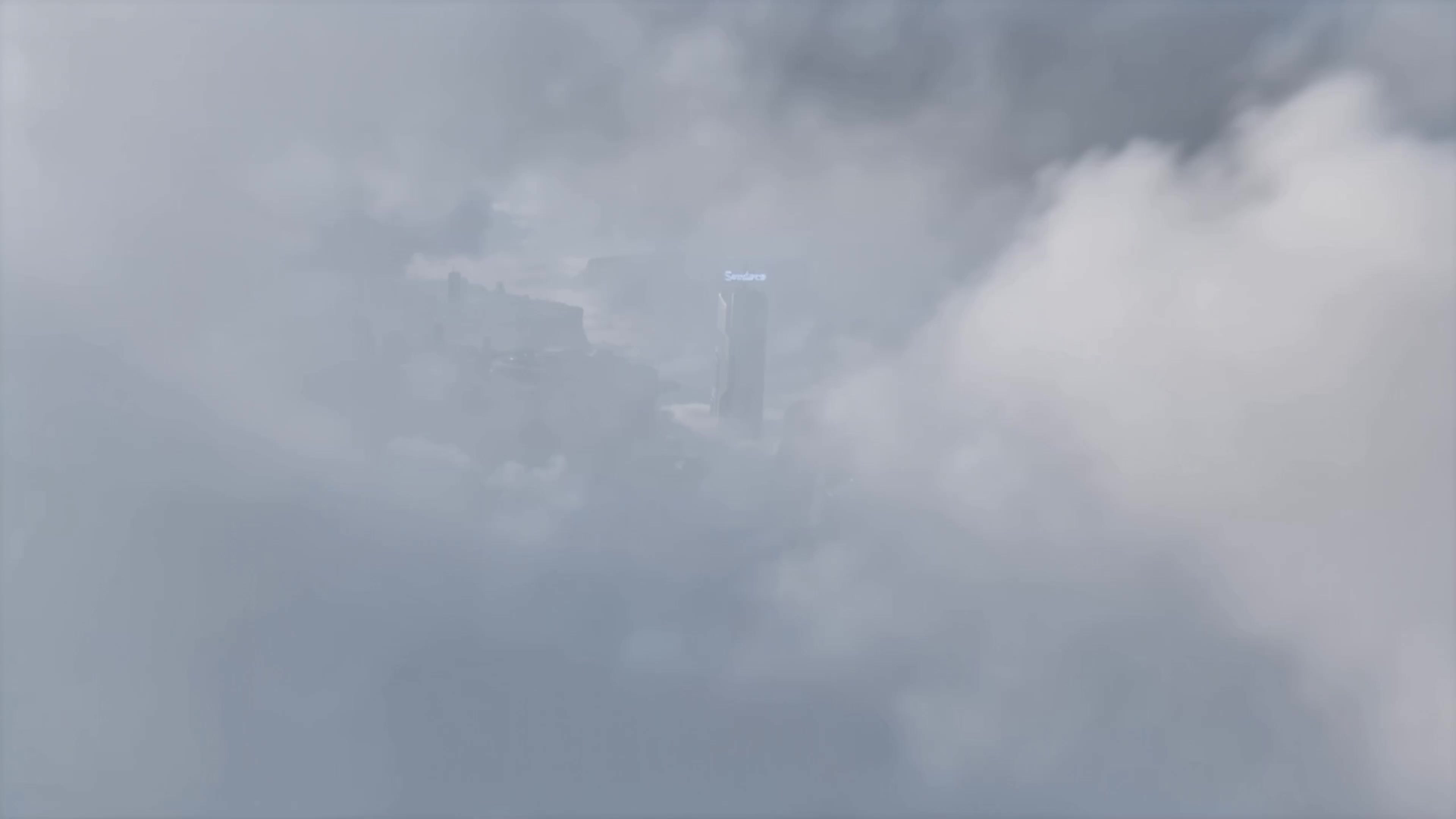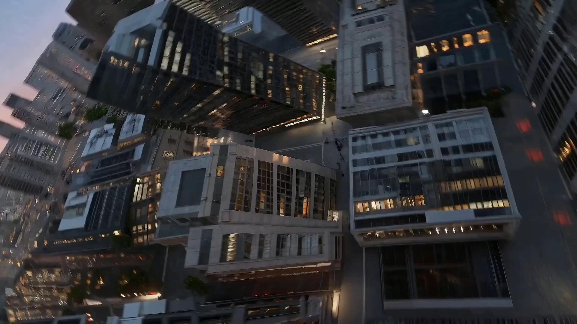 @Image 1 as the first frame to create a tech park concept video. The tall building in the image serves as the visual center, using the same first-person diving perspective to convey the futuristic tech atmosphere of the park in