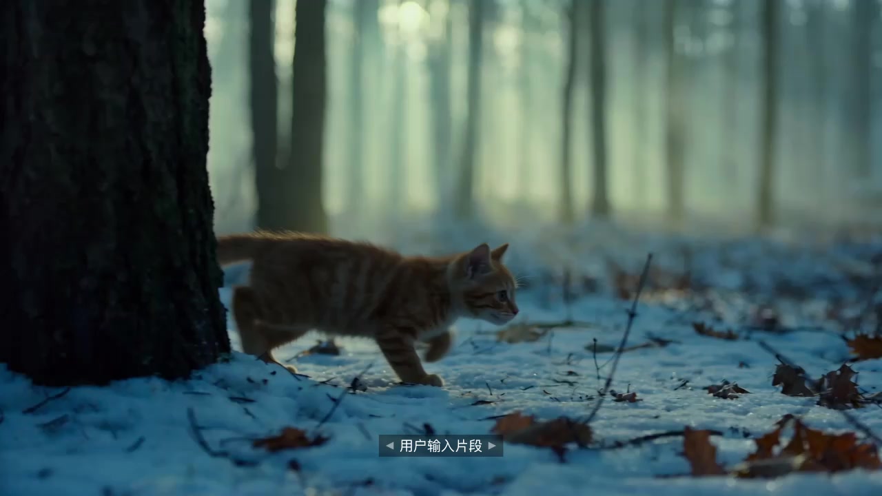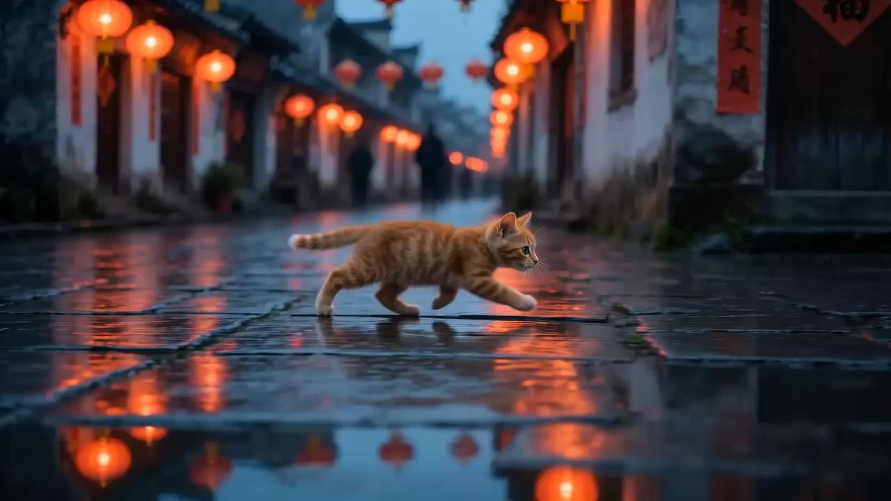 Core requirement: 15-second cinematic short video, 3 core scenes with seamless narrative transitions, following one adorable orange kitten running throughout as the visual thread — from forest wonderland to festive old town to cozy New Year home, finally leaping into a child's arms.