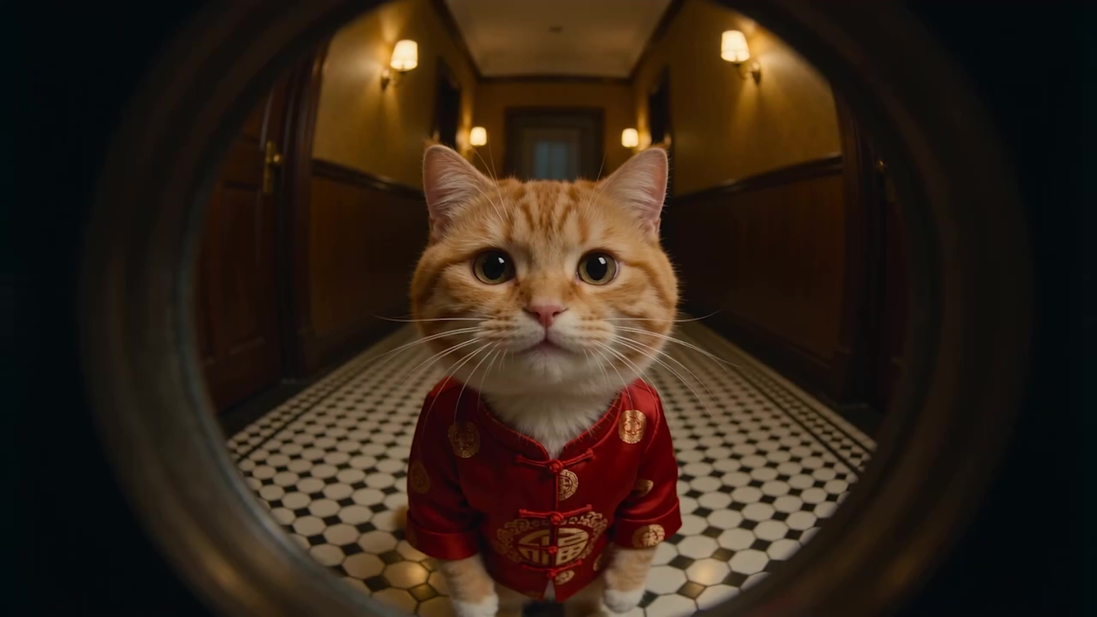@Video 1. A cute kitten wearing red New Year clothes looks up at the camera with a slight smile. The background is a retro corridor with dark yellow walls, black-and-white polka-dot floor tiles, and warm yellow wall sconces. The lens distortion creates a spatial compression effect like a door peephole. Motion references