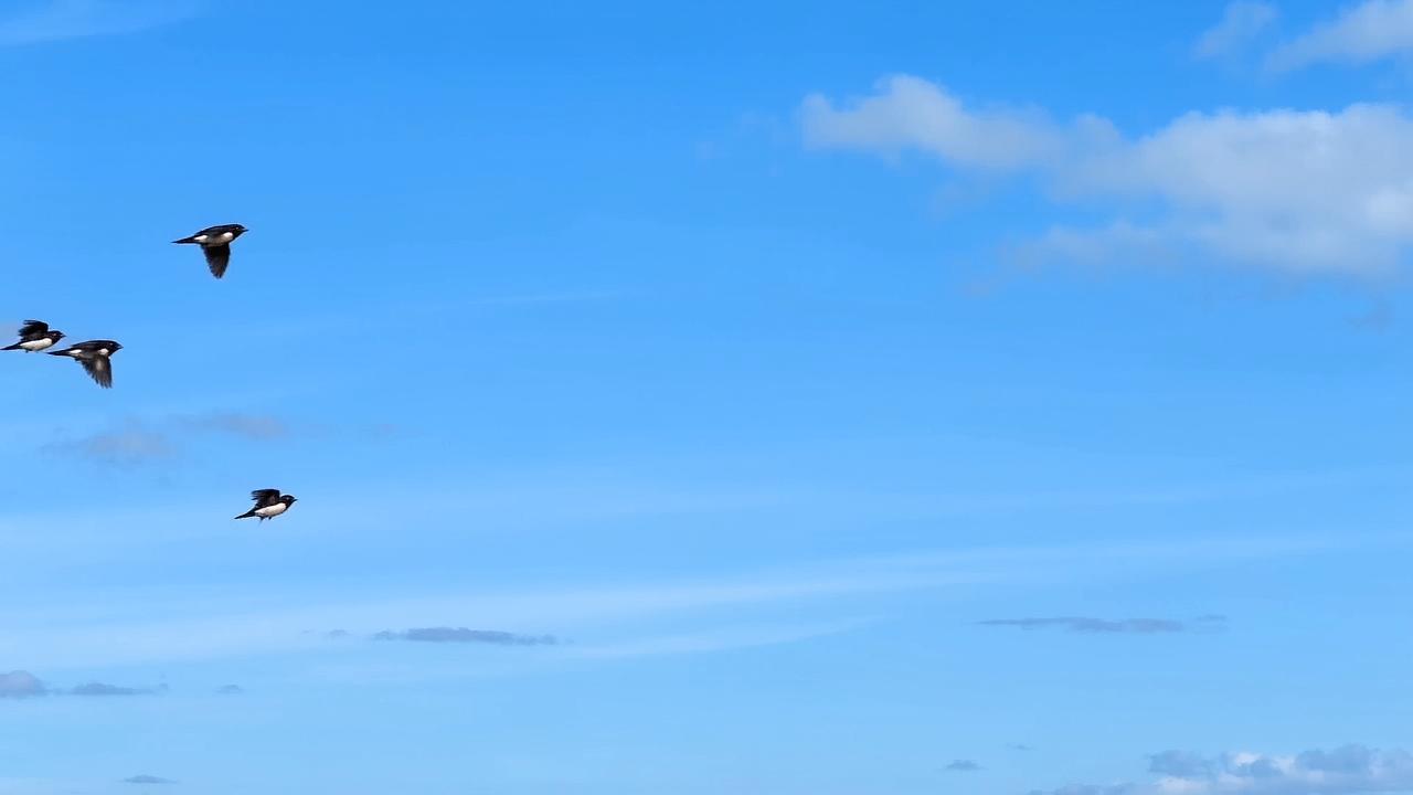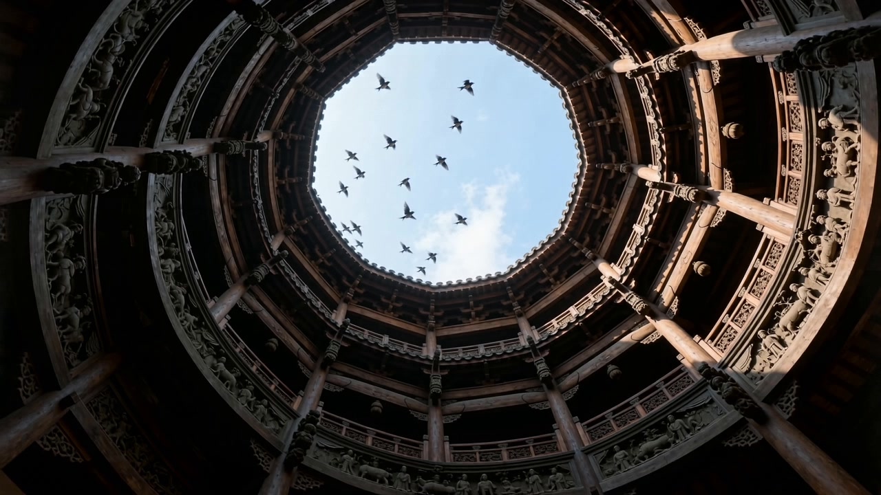 @Video 1, generate an upward-looking shot of a skywell from inside a traditional Chinese building. A deep octagonal wooden dome structure covered in intricate woodcarving details, with layered beams and delicate pendant carvings revealing antique grandeur through chiaroscuro contrast. The central opening of the dome frames the clear blue sky and white clouds, with a flock of birds flying across the sky referencing